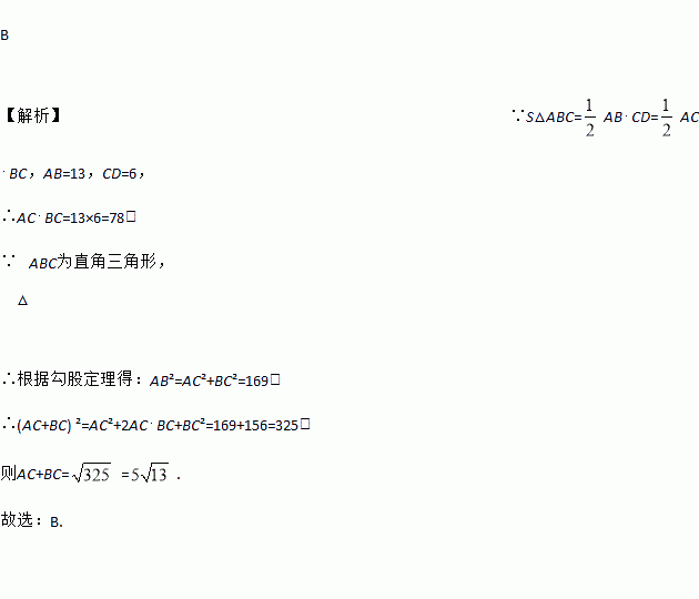 在Rt△ABC中,∠C=90°,CD⊥AB于点D,AB=13,CD=6,则AC+BC=( )