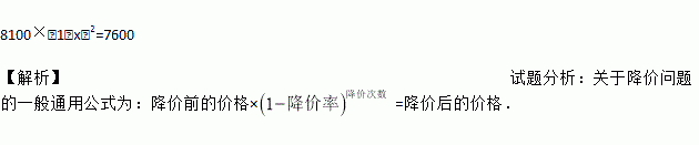 8100×(1﹣x)2=7600 【解析】试题分析:关于降价问题的一般通用公式为:降价前的价格×=降价后的价格.