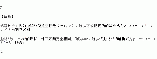 一抛物线和抛物线y=-2x2的形状、开口方向完全相同,顶点坐标是(-1,3),则该抛物线的解析式为