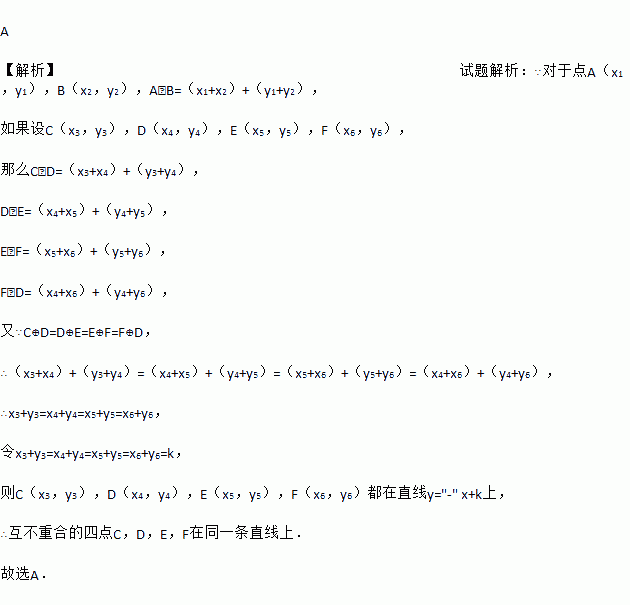 对于点A(x1,y1),B(x2,y2),定义一种运算:A⊕B=(x1+x2)+(y1+y2).例如,A(﹣5,4),B(2,﹣3),A⊕B=(﹣5+2)+(4﹣3)=﹣2.若互不重合的四点C,D,E,F,满足C⊕D=D⊕E=E⊕F=F⊕D,则C,D,E,F四点( )