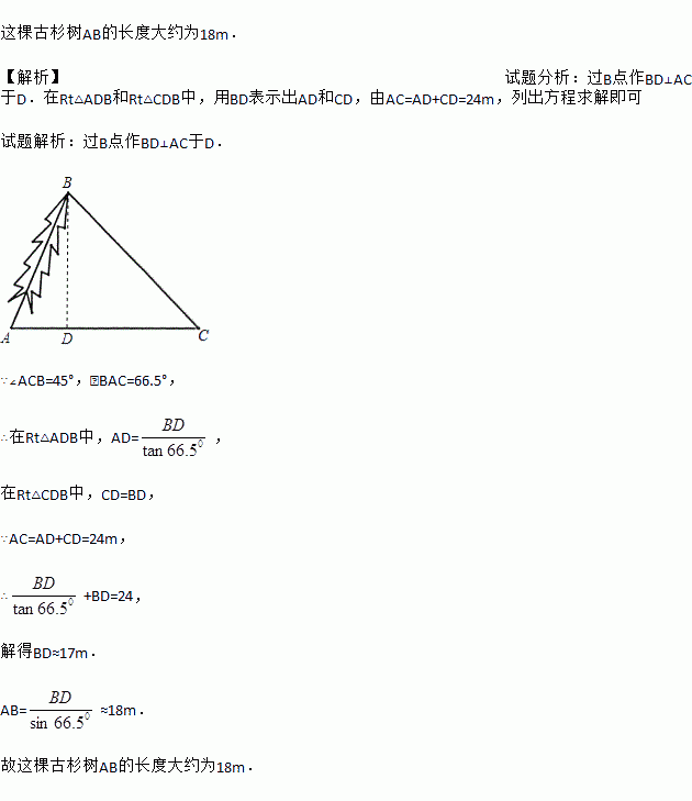 为了对一棵倾斜的古杉树AB进行保护,需测量其长度.如图,在地面上选取一点C,测得∠ACB=45°,AC=24m,∠BAC=66.5°,求这棵古杉树AB的长度.(结果取整数)