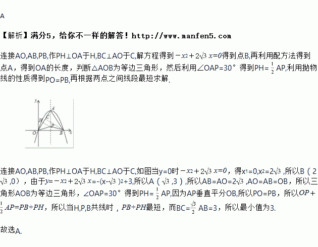 如图所示,在平面直角坐标系中,抛物线y=-x2+2x的顶点为A点,且与x轴的正半轴交于点B,P点为该抛物线对称轴上一点,则OP+AP的最小值为( ).