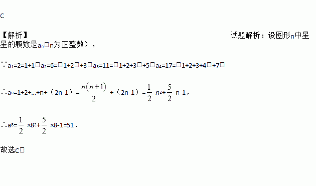 C 【解析】试题解析:设图形n中星星的颗数是an(n为正整数), ∵a1=2=1+1,a2=6=(1+2)+3,a3=11=(1+2+3)+5,a4=17=(1+2+3+4)+7, ∴an=1+2+…+n+(2n-1)=+(2n-1)=n2+n-1, ∴a8=×82+×8-1=51. 故选C.
