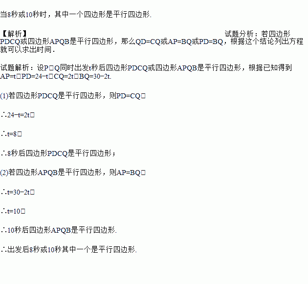 已知:如图,在梯形ABCD中,AD∥BC,AD=24cm,BC=30cm,点P自点A向D以1cm/s的速度运动,到D点即停止.点Q自点C向B以2cm/s的速度运动,到B点即停止,直线PQ截梯形为两个四边形.问当P,Q同时出发,几秒时其中一个四边形为平行四边形?