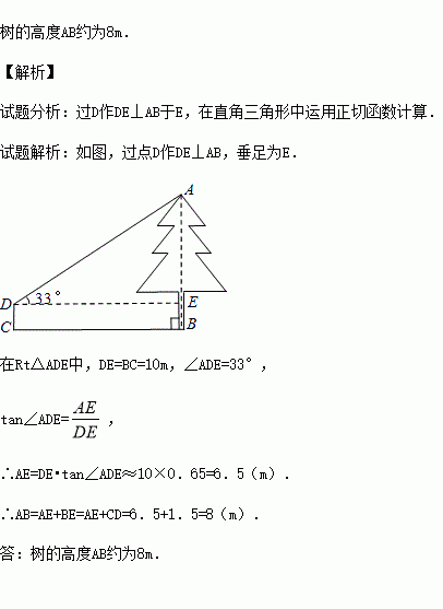 如图,小明欲利用测角仪测量树的高度.已知他离树的水平距离BC为10m,测角仪的高度CD为1.5m,测得树顶A的仰角为33°.求树的高度AB.(参考数据:sin33°≈0.54,cos33°≈0.84,tan33°≈0.65)