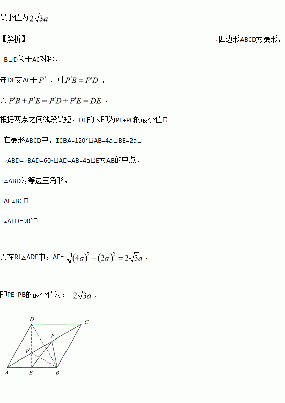 如图,在菱形ABCD中,AB=4a,点E在AB上,BE=2a,∠CBA=120°,点P为AC上一动点,求PE+PB的最小值。