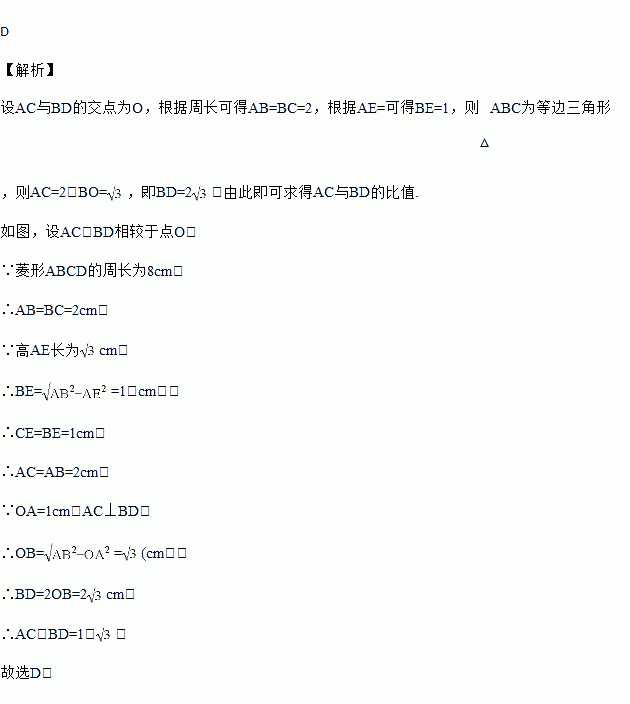 如图,菱形ABCD的周长为8 cm,高AE长为