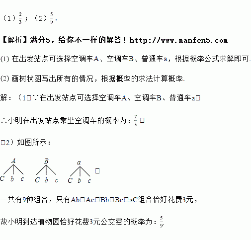 小明周末要乘坐公交车到植物园游玩,从地图上查找路线发现,几条线路都需要换乘一次.在出发站点可选择空调车A、空调车B、普通车a,换乘站点可选择空调车C,普通车b、普通车c,且均在同一站点换乘.空调车投币2元,普通车投币1元.