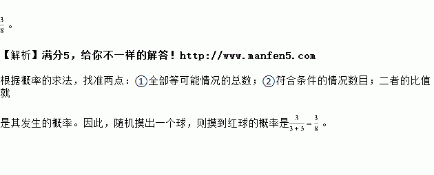 不透明的袋子里装有3个红球5个白球,它们除颜色外其它都相同,从中随机摸出一个球,则摸到红球的概率是 ▲ .