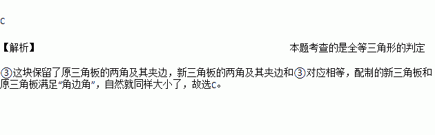 玻璃三角板摔成三块如图,现在到玻璃店在配一块同样大小的三角板,最省事的方法( )