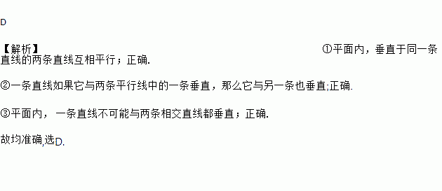 下列与垂直相交的说法:①平面内,垂直于同一条直线的两条直线互相平行;②一条直线如果它与两条平行线中的一条垂直,那么它与另一条也垂直;③平面内, 一条直线不可能与两条相交直线都垂直,其中说法错误个数有( )