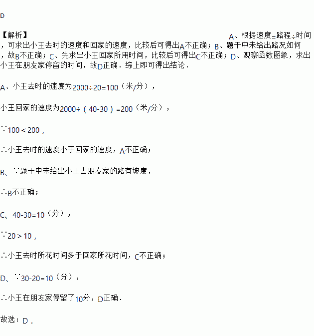 C. 小王去时所花时间少于回家所花时间 D. 小王在朋友家停留了