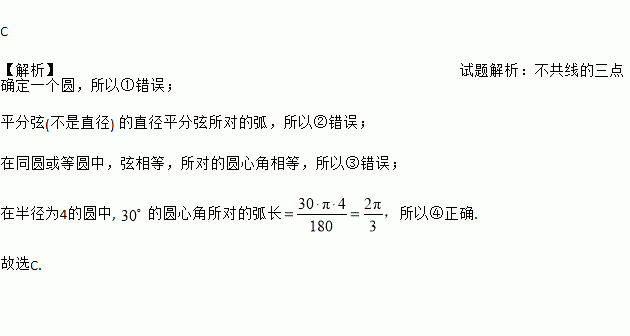 下列命题:①三点确定一个圆;②平分弦的直径平分弦所对的弧;③相等的弦所对的圆心角相等;④在半径为