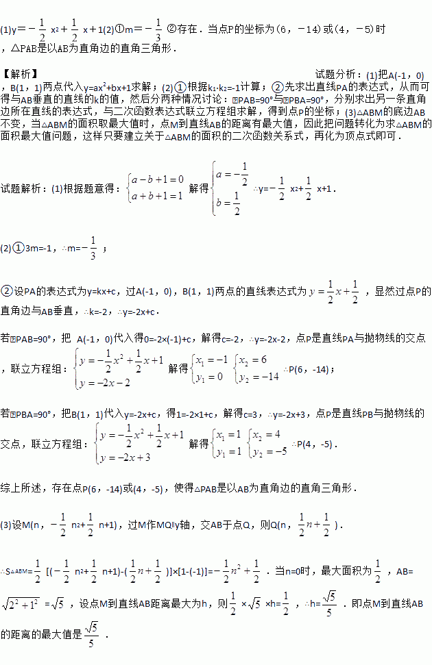 Èçͼ£¬ÒÑÖªÅ×ÎïÏßy£½ax2£«bx£«1¾¹ýA(£1£¬0)£¬B(1£¬1)Á½µã£®