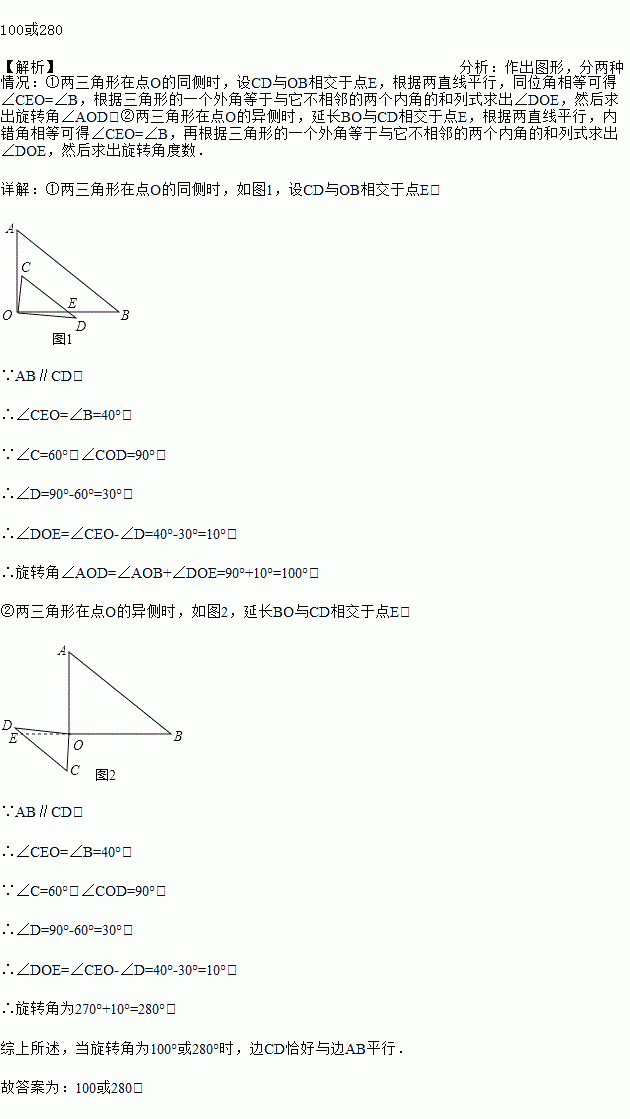 如图,△AOB和△COD中,∠AOB=∠COD=90°,∠B=40°,∠C=60°,点D在OA上.将△COD绕点O顺时针旋转一周,在旋转过程中,当旋转角是_____°时,CD∥AB.