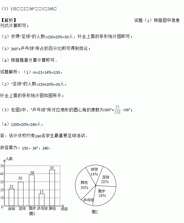 (4)已知该校共有1200名学生,请你估计该校约有 名学生最喜爱足球活动.