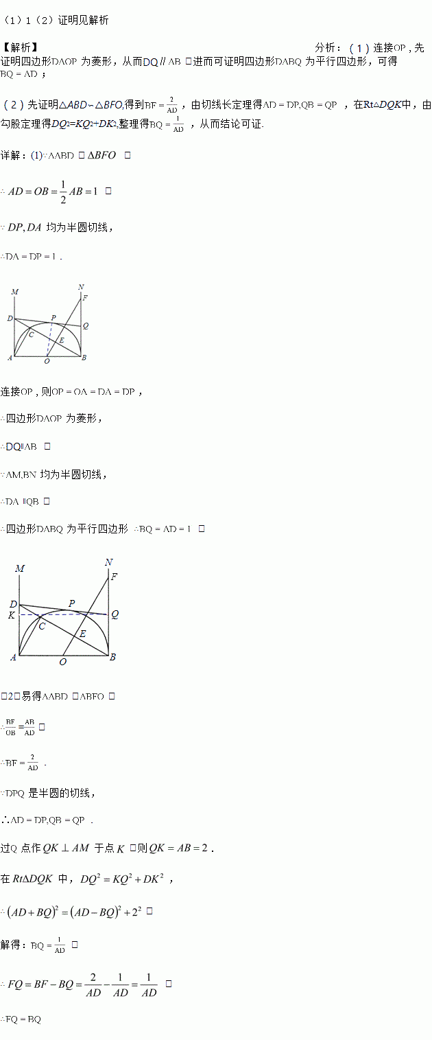 如图,AB是半圆O的直径,AB=2,射线AM、BN为半圆O的切线.在AM上取一点D,连接BD交半圆于点C,连接AC.过O点作BC的垂线OE,垂足为点E,与BN相交于点F.过D点作半圆O的切线DP,切点为P,与BN相交于点Q.