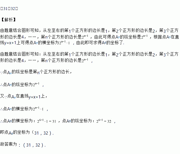 如图,正方形A1B1C1O,A2B2C2C1,A3B3C3C2, ……,按如图的方式放置。点A1,A2,A3,……和点C1,C2,C3……分别在直线y=x +1和x轴上,则点A6的坐标是____________.