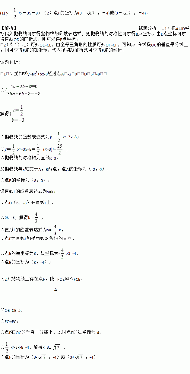 如图,在平面直角坐标系中,已知抛物线y=ax2+bx-8与x轴交于A,B两点,与y轴交于点C,直线l经过坐标原点O,与抛物线的一个交点为D,与抛物线的对称轴交于点E,连接CE,已知点A,D的坐标分别为(-2,0),(6,-8).