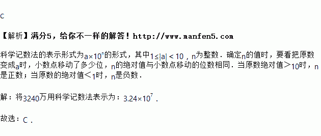 拒绝“餐桌浪费”,刻不容缓.节约一粒米的帐:一个人一日三餐少浪费一粒米,全国一年就可以节省3240万斤,这些粮食可供9万人吃一年.“3240万”这个数据用科学记数法表示为( )