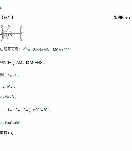 如图,对折矩形纸片ABCD,使AB与DC重合得到折痕EF,将纸片展平;再一次折叠,使点D落到EF上点G处,并使折痕经过点A,展平纸片后∠DAG的大小为( )