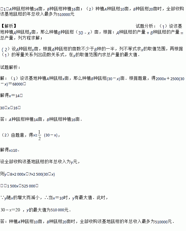 (1)若该基地收获A、B两种瓯柑的年总产量为68000千克,求A、B两种瓯柑各种多少亩?