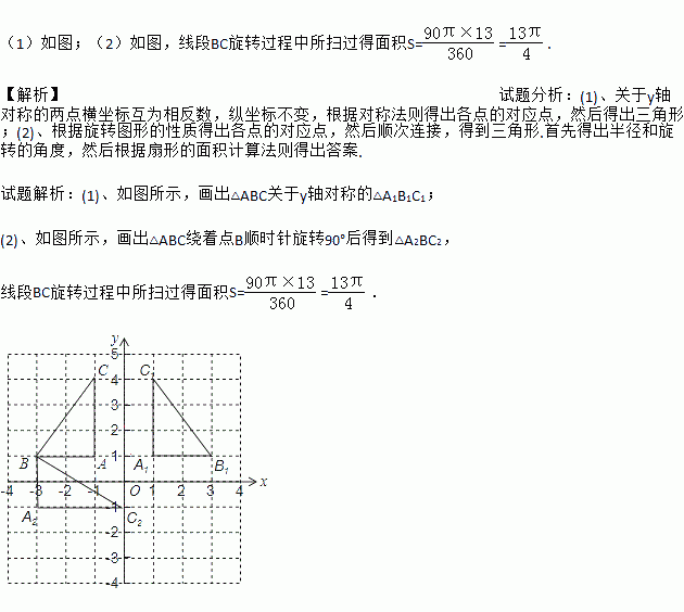 (2)将△ABC绕着点B顺时针旋转90°后得到△A2BC2,请在图中画出△A2BC2,并求出线段BC旋转过程中所扫过的面积(结果保留