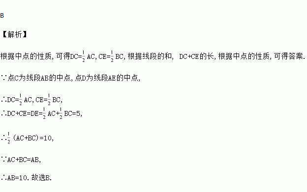 如图, C为线段AB上任一点,点D是线段AC的中点,点E是线段CB的中点,若线段DE为5,则线段AB的长是( )