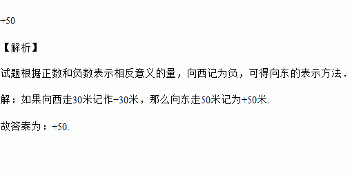 如果向西走30米记作―30米,那么向东走50米记为____________米.
