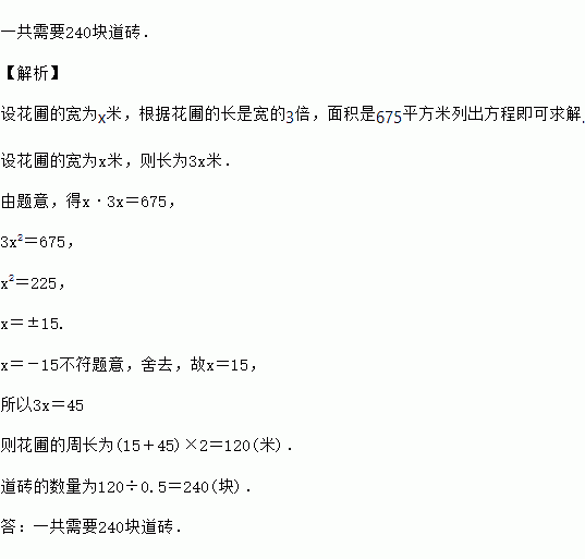 某小区有一块长方形的花圃,为了加强对花圃的保护,小区管理人员准备用道砖沿花圃的边缘将其围起来.已知花圃的长是宽的3倍,面积是675平方米.每块道砖的长为50厘米,求一共需要多少块道砖.