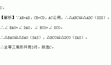 如图,在四边形中,对角线AB=AD,CB=CD,若连接AC、BD相交于点O,则图中全等三角形共有【 】