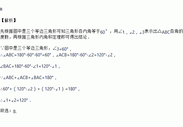 三个等边三角形的摆放位置如图,若∠3=60°,则∠1+∠2的度数为( )