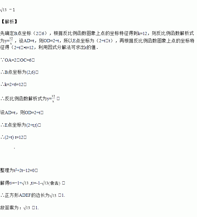 的图象上,OA=2,OC=6,则正方形ADEF的边长为______.