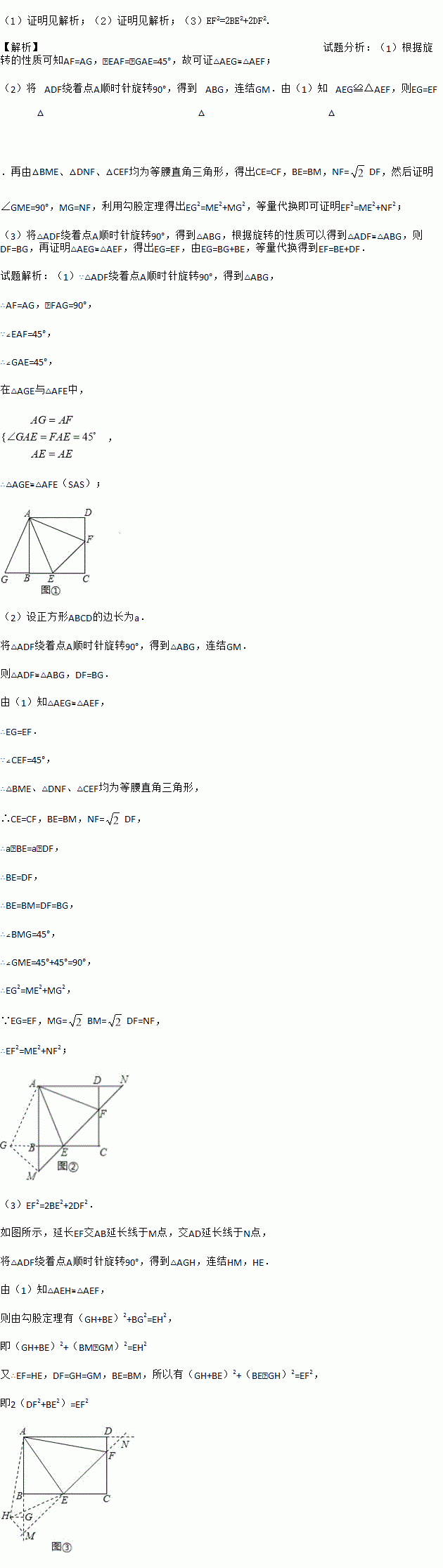 (1)将△ADF绕着点A顺时针旋转90°,得到△ABG(如图①),求证:△AEG≌△AEF;