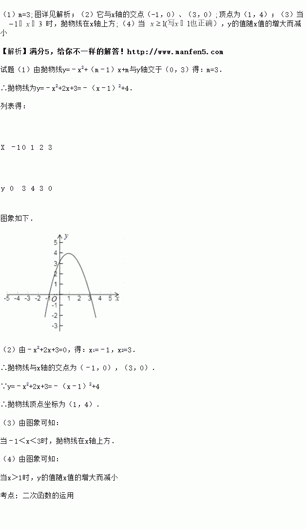 (本题满分12分)抛物线y=-x2+(m-1)x+m与y轴交于(0,3)点.