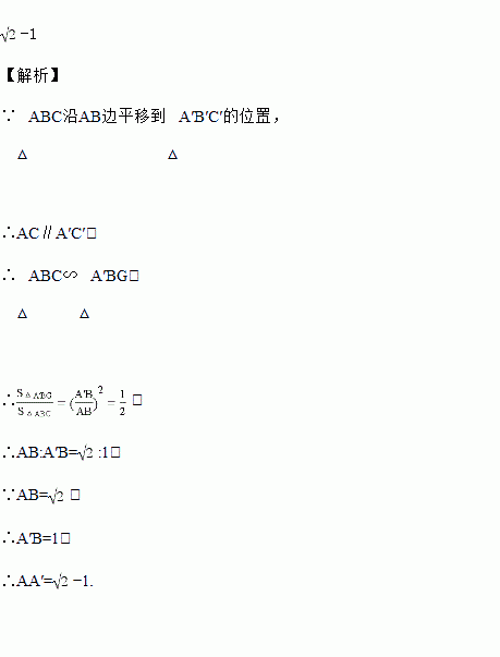 如图,把△ABC沿AB边平移到△A′B′C′的位置,它们的重叠部分(即图中的阴影部分)的面积是△ABC的面积的一半,若AB=, 则此三角形移动的距离AA′=________ .