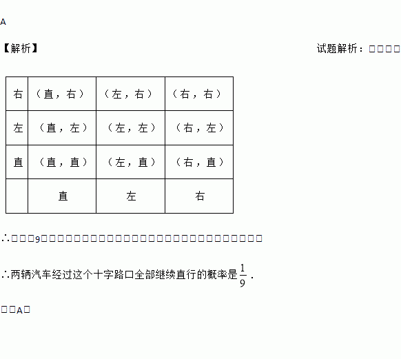 经过某十字路口的汽车,它可以继续直行,也可以向左转或向右转.如果这三种可能性大小相同,则两辆汽车经过这个十字路口全部继续直行的概率是( )