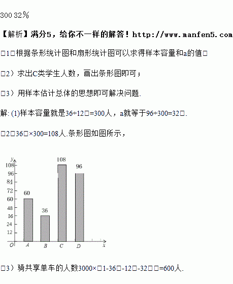 (3)若该校有3000人,则骑共享单车的有多少人?