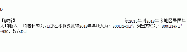 中国“一带一路”战略给沿线国家和地区带来很大的经济效益,沿线某地区居民2016年人均年收入300美元,预计2018年人均年收入将达到950美元,设2016年到2018年该地区居民人均年收入平均增长率为x,可列方程为( )