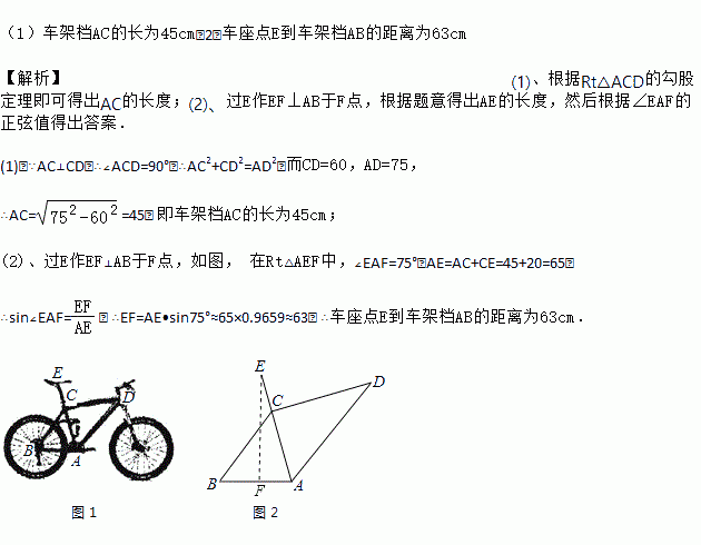 为倡导“低碳生活”,常选择以自行车作为代步工具,如图1所示是一辆自行车的实物图.车架档CD与AD的长分别为60cm,75cm,且AC⊥CD,垂足为C,座杆CE的长为20cm,点A,C,E在同一条直线上,且∠CAB=75°,如图2.