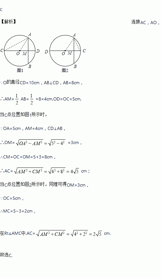 已知⊙O的直径CD=10cm,AB是⊙O的弦,AB⊥CD,垂足为M,且AB=8cm,则AC的长为( )