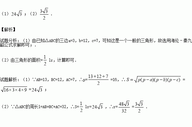 问题:如图,在△ABC中,AB=13,BC=12,AC=7,⊙O内切于△ABC,切点分别是D、E、F.