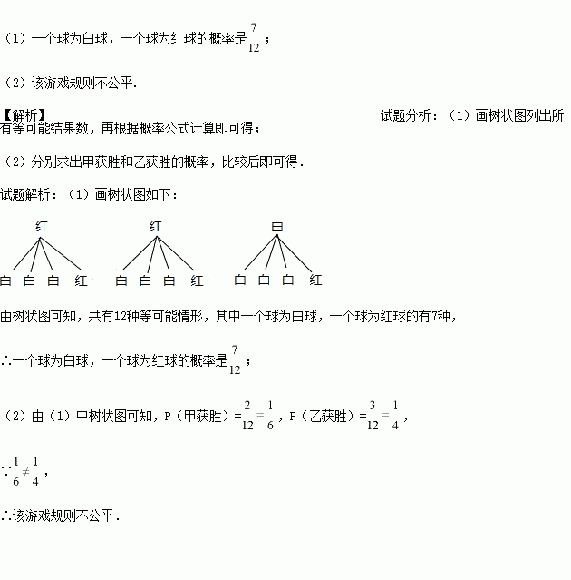 游戏规则如下:在两个不透明的盒子中,一个盒子里放着两个红球,一个白球;另一个盒子里放着三个白球,一个红球,从两个盒子中各摸一个球,若摸得的两个球都是红球,甲胜;摸得的两个球都是白球,乙胜,否则,视为平局.若为平局,继续上述游戏,直至分出胜负为止.