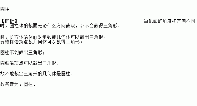 Ô²Öù ¡¾½âÎö¡¿µ±½ØÃæµÄ½Ç¶ÈºÍ·½Ïò²»Í¬Ê±£¬Ô²ÖùÌåµÄ½ØÃæÎÞÂÛʲô·½Ïò½ØÈ¡£¬¶¼²»»á½ØµÃÈý½ÇÐΣ® ¡¾½âÎö¡¿ ³¤·½ÌåÑØÌåÃæ¶Ô½ÇÏ߽ؼ¸ºÎÌå¿ÉÒԽسöÈý½ÇÐΣ» ÎåÀâÖùÑØ¶¥µã½Ø¼¸ºÎÌå¿ÉÒԽصÃÈý½ÇÐΣ» Ô²Öù²»ÄܽسöÈý½ÇÐΣ» Ô²×¶ÑØ¶¥µã¿ÉÒԽسöÈý½ÇÐΣ® ¹Ê²»ÄܽسöÈý½ÇÐεļ¸ºÎÌåÊÇÔ²Öù£® ¹Ê´ð°¸Îª£ºÔ²Öù£®