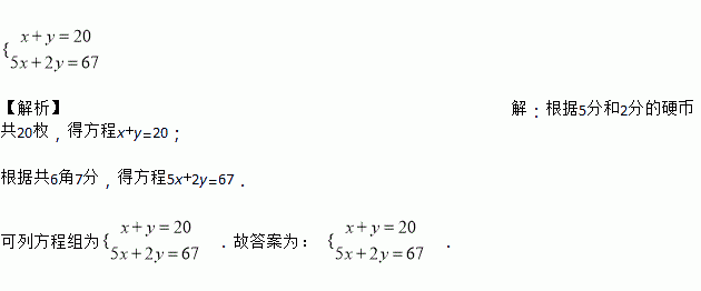小红有5分和2分的硬币共20枚,共6角7分,设5分硬币有枚,2分硬币有 枚,则可列方程组为______________________.