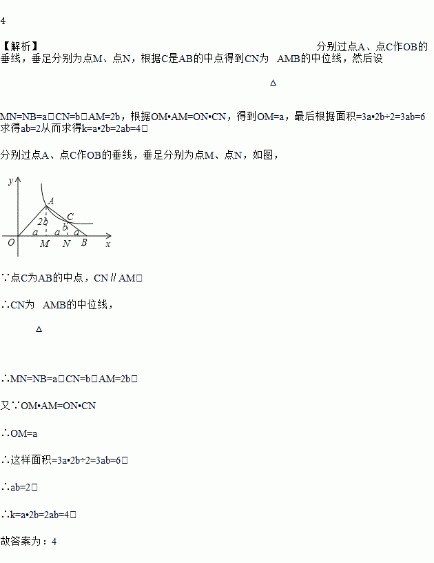 如图,反比例函数y=(k>0)在第一象限的图象经过A、C两点,点C是AB的中点,若△OAB的面积为6,则k的值为_____.