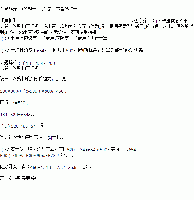 °Ù»õÉ̳¡¡°Ê®Ò»¡±ÆÚ¼ä¸ã´ÙÏú£¬Ò»´ÎÐÔ¹ºÎï²»³¬¹ý200Ôª²»ÓŻݣ»³¬¹ý200Ôª£¬µ«²»³¬¹ý500Ôª£¬°´¾ÅÕÛÓŻݣ»³¬¹ý500Ôª£¬³¬¹ý²¿·Ö°´°ËÕÛÓŻݣ¬ÆäÖеÄ500ÔªÈÔ°´¾ÅÕÛÓŻݣ¬Ä³ÈËÁ½´Î¹ºÎï·Ö±ðÓÃÁË134ÔªºÍ466Ôª£®ÎÊ£º