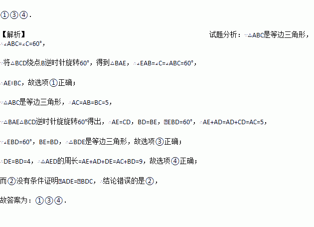 E,连接ED,若BC=5,BD=4.则下列四个结论:①AE∥BC;②∠ADE=∠BDC;③△BDE是等边三角形;④△AED的周长是9.其中正确的结论是__(把你认为正确结论的序号都填上.)