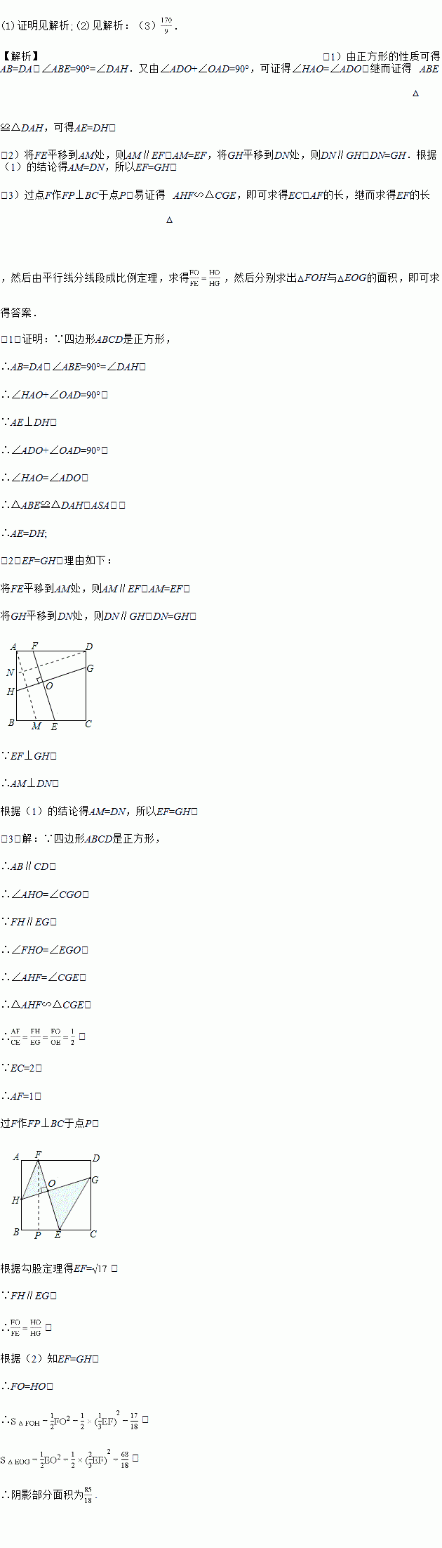 (1)如图①,在正方形ABCD中,点E,H分别在BC,AB上.若AE⊥DH于点O,求证:AE=DH.