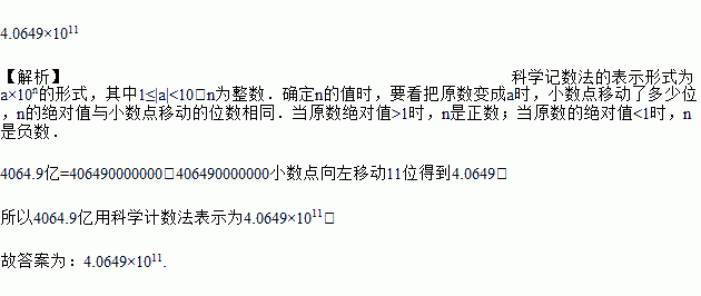 2017年襄阳全市实现地区生产总值4064.9亿元,数据4064.9亿用科学计数法表示为_______.